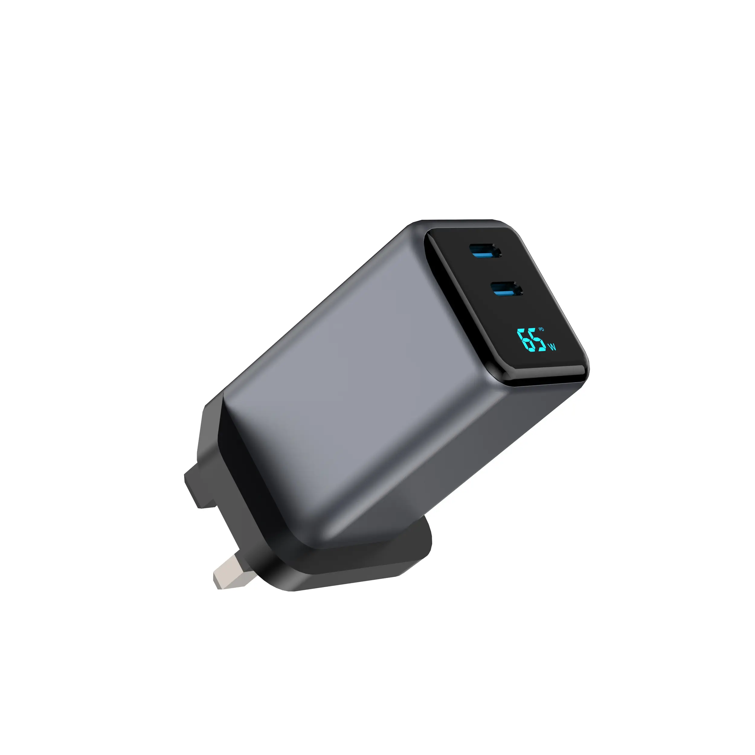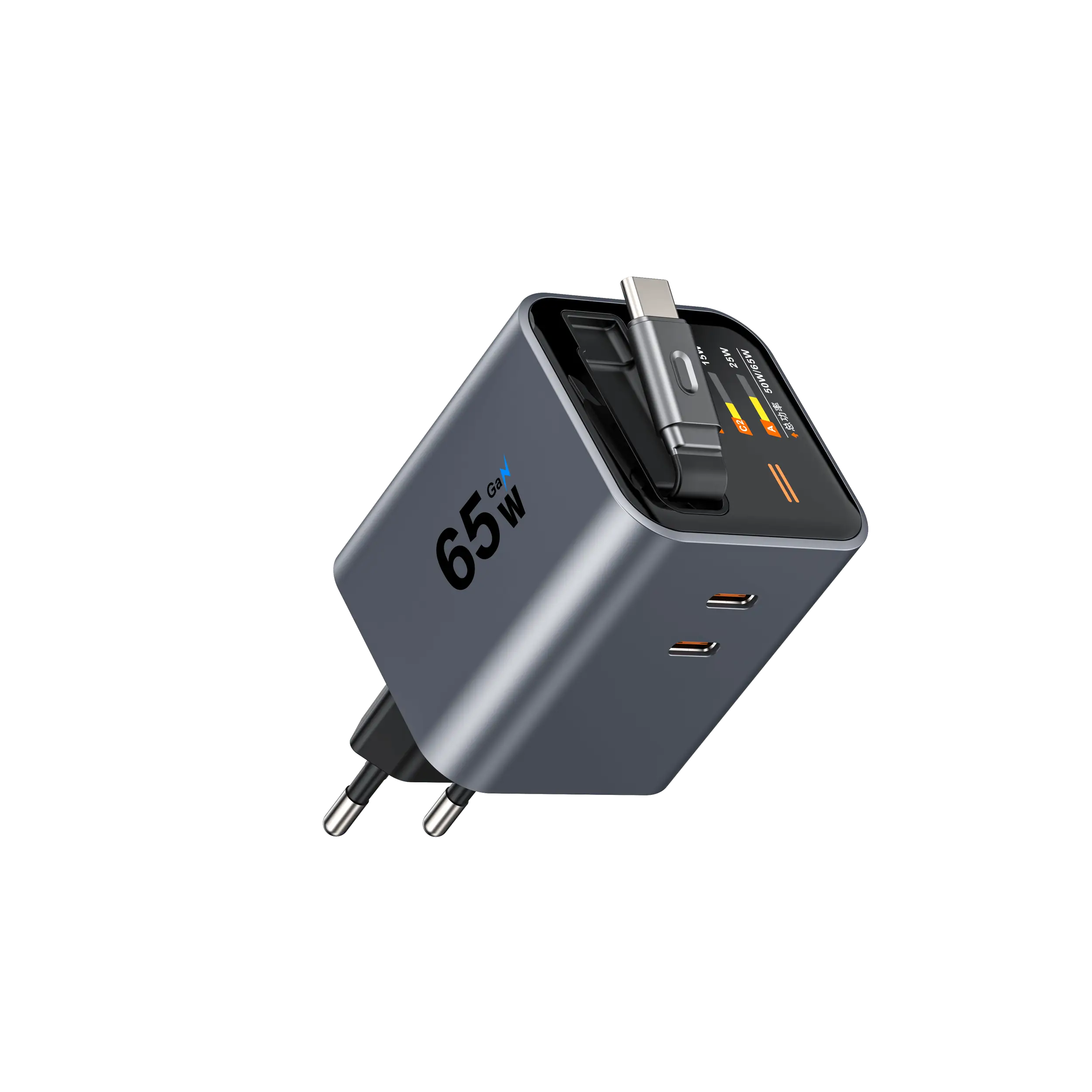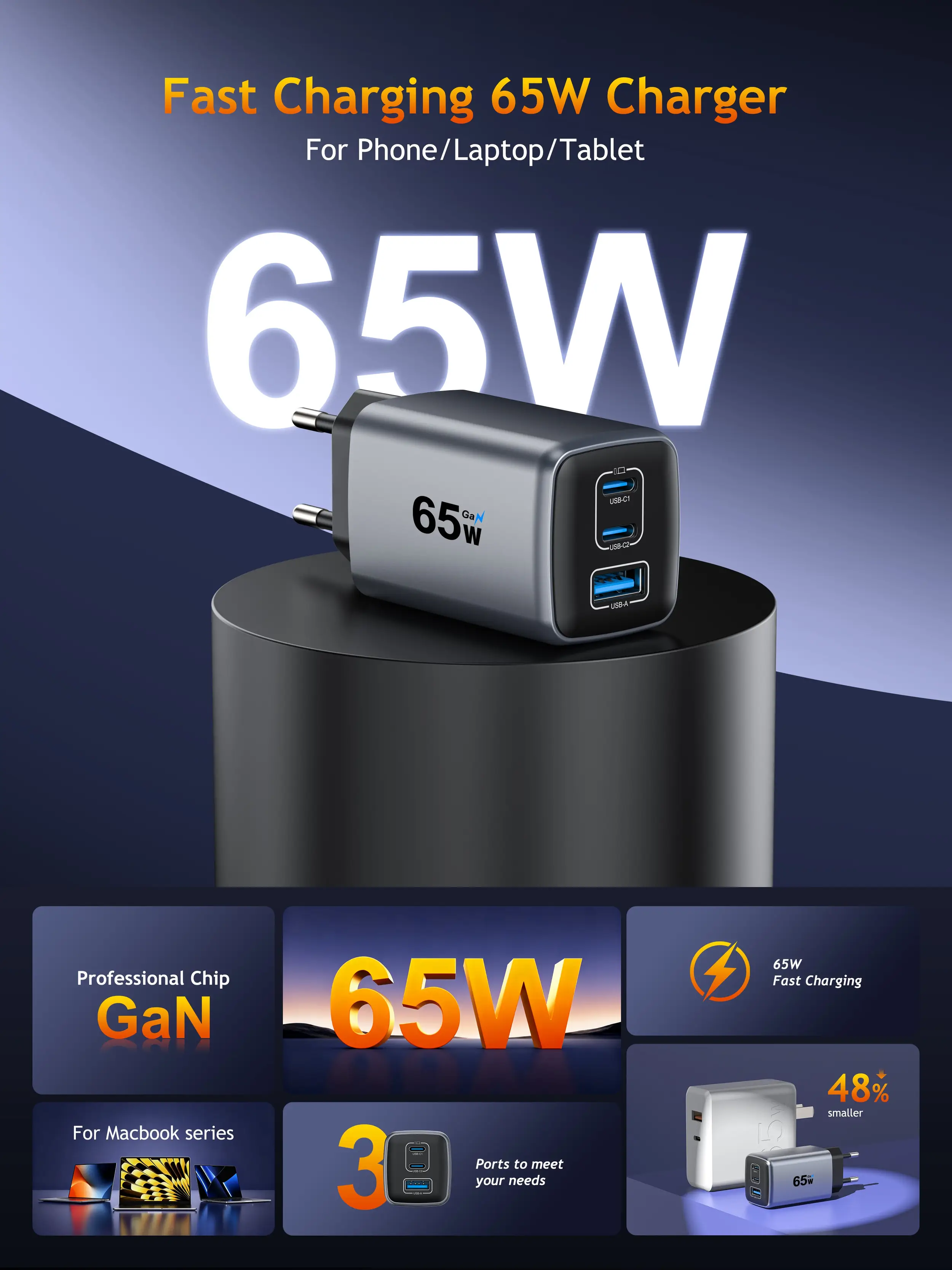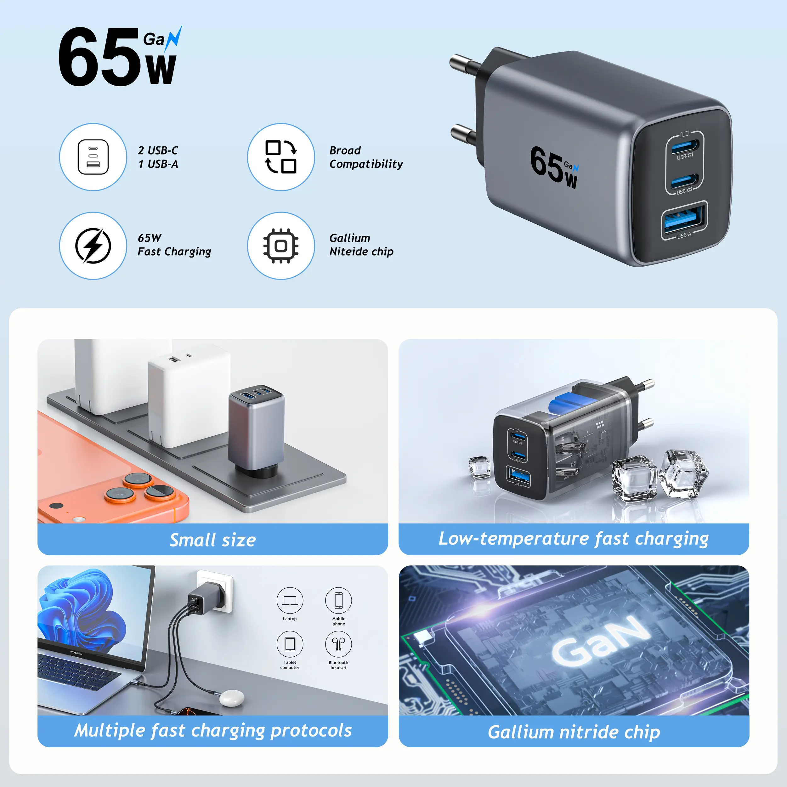 Compact GaN-based charger delivering 65W fast charging with multi-device compatibility, ensuring efficient power supply for laptops, tablets, and smartphones.